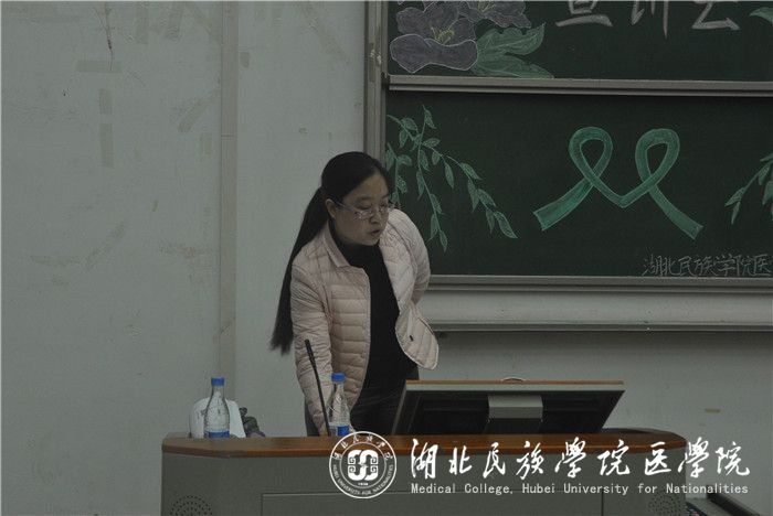 宣讲会伊始,别老师以鲁迅、林黛玉因结核病逝世事件为引使同学们初步了解结核病。接着,她列出数据说明近十年来我州在结核病甲乙类传染病发病人数中位居湖北省首位,形势非常严峻。而后,她围绕结核病的传播途径、常见病症和防治措施进行具体讲解。她提醒大家结核病可通过飞沫传播,在人流量大的地方要记得戴口罩保护自己,不给结核病菌可乘之机。结核病常见于咳嗽、咳痰、体温低热等症状,若患上结核病要立即就医,并且要彻底治疗以防复发。由于学校是人群高度集中场所,故对于学校如何做好结核防治工作,别老师提出应开展多形式的结核防治工作,及时发现、报告、管理肺结核疫情,积极做好预防工作。同时她告诫青年学生要少熬夜,注意作息规律,多锻炼身体。