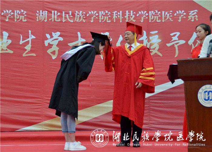 典礼在庄严的国歌声中拉开帷幕。医学院党委书记刘红致辞,他殷切希望全体毕业生应以仁爱立德,不忘大医精诚之精髓;以学明智,以勤为径,献身医学事业;宁静致远,胸怀理想,用医学梦托起中国梦。随后,袁德培宣读《湖北民族学院医学院2018届优秀毕业生表彰文件》、《湖北民族学院科技学院医学系2018届优秀毕业生表彰文件》,罗洪斌宣读《湖北民族学院2018年毕业生学士学位授予名单》、《湖北民族学院科技学院医学系2018年毕业生学士学位授予名单》。