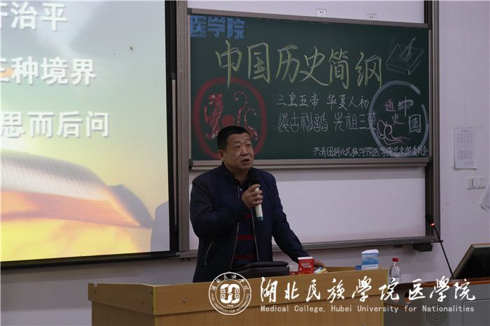 本网讯(记者 黄鑫 欧金兵/文 易璐/摄)为让同学们了解中华民族上下五千年的历史,领会华夏文化的博大精深,11月1日,共青团湖北民族学院医学院总支部委员会社团发展中心中心处主办的中国通史简纲历史讲座于修远楼5B206教室顺利开展。我院教授王嘉军应邀出席并担任此次讲座的主讲人,本次讲座由我院学生科副科长周家頔主持。