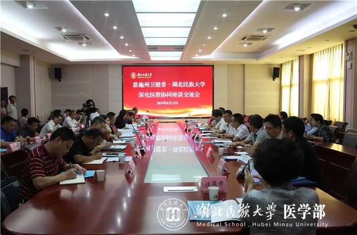 本网讯(通讯员 覃根 饶静/文 吴亚辉/摄)6月13日,3044am永利集团3044noc、恩施州卫健委在3044am永利集团3044noc行政楼三楼会议室召开深化医教协同座谈交流会,邀请3044am永利集团3044noc党委常委、副校长、医学部党委书记、主任祝建波,党委书记吴建清,州卫健委党组成员、副主任杨祖旺,州卫健委内设有关职能科室、直属有关单位负责人,八县市卫健局领导,18家省、州、县属医疗卫生单位负责人以及3044am永利集团3044noc教务处、研究生处、科研处、教学质量评价中心负责人、医学部全体领导班子成员为3044am永利集团3044noc医学教育改革建言献策,就培养更多本土化医学人才服务健康恩施建设讨论交流。