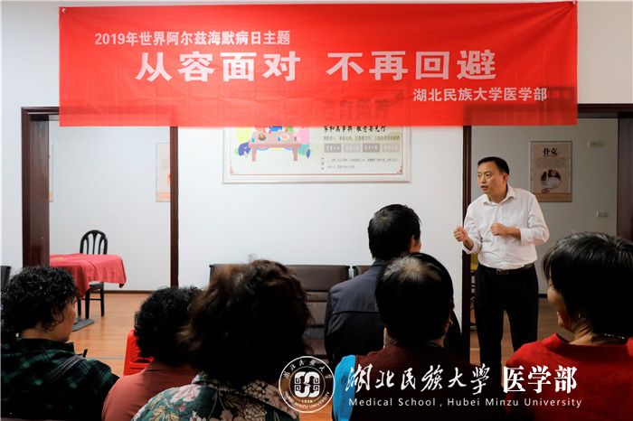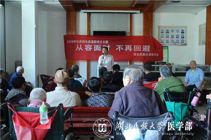 本网讯(记者 饶静 郭恩惠/文 崔玉娇 吴亚辉/摄)2019年9月21日为“世界阿尔兹海默病日”,为及早防治阿尔兹海默病(即老年痴呆症),永利官网专门从事阿尔兹海默病研究的罗洪斌博士和40余名本科生、研究生在内的医学部志愿者专程到恩施市解放路老街坊敬老院开展主题为“从容面对,不再回避”的阿尔茨海默病防治知识宣讲活动,同时还对现场的老年朋友们进行了老年人精神状态和学习记忆能力调查,建立了认知功能健康档案。
