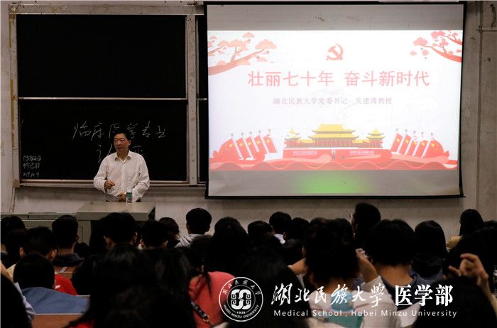 本网讯(记者 覃根/文 汪诗名/摄)10月9日,学校党委书记吴建清以《壮丽七十年 奋斗新时代》为题,在怡康楼8104教室为我部医学生讲授了一堂思政课。马克思学院院长徐铜柱、党委宣传部副部长万力、医学部党委副书记黄晓波及医学部学生200余人参与本次讲座。