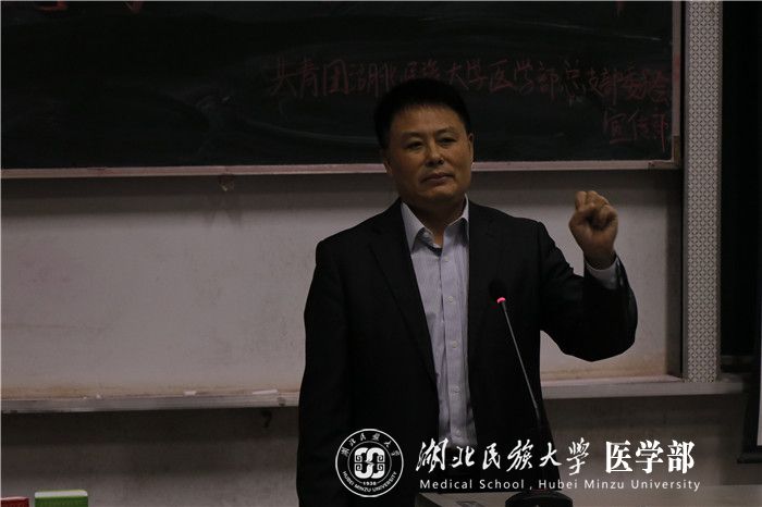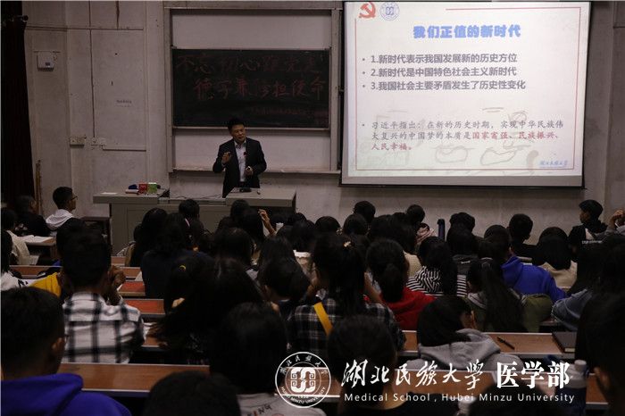 本网讯(记者 周玉珠 郭恩惠/文 汪诗名/摄)为进一步加强我部学生思想政治教育,10月14日晚,马克思主义学院院长徐铜柱教授在医学部8105教室讲授以“不忘初心跟党走,德学兼修担使命”为主题的思政课。讲座由医学部党委副书记黄晓波主持,200余名2019级新生到场聆听。