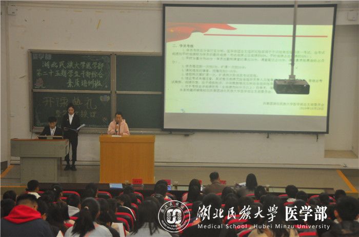 12月1日,医学部第二十五期学生干部综合素质培训班结业典礼在修远楼5A207教室举行。在典礼中,张一帆、张鑫、张嘉敏三位同学作为代表分享培训心得,团总支书记作干训总结,学生工作办公室副主任周家頔宣读干训结果。共有30名学生受到“优秀学员”荣誉称号并进行了颁奖仪式。最后,医学部党委副书记黄晓波总结讲话。他强调,干部要具有道德意识、“红线”意识和实践意识,努力提高自身综合素质。
