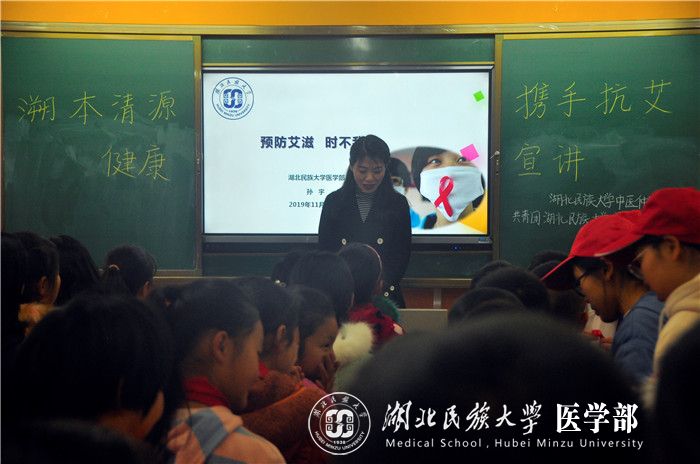 本网讯(通讯员 张健 付傲/文 吴亚辉/摄)11月28日,由医学部和美术与设计学院团总支社会实践与志愿者工作部、中医仲景协会联合举办的以“溯本清源 携手抗艾”为主题的预防艾滋病宣传活动于恩施金茂小学顺利开展。金茂小学校长郭先灿、副校长吕宗梅和部分老师应邀参加,医学部学科建设科老师孙宇担任讲座主讲人,100余名志愿者参与其中。