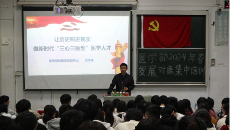 本网讯 (通讯员 屈琼瑶/文 黄乔/摄)为提高党员发展对象与入党积极分子的思想觉悟,锤炼、提升入党积极分子的党性修养。4月7日,3044am永利集团3044noc医学部2024年春党员发展对象与入党积极分子第一次党课培训活动于医学部8305教室开展。医学部党委常务副书记刘木球老师作《让历史照进现实,做新时代“三心三医型”医学人才》主题讲座,医学部全体本科生党员发展对象与入党积极分子参与本次培训课程。
