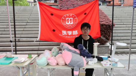 各摊位人员热情地向路过同学介绍所卖物品,购买者细心挑选并询问物品的价格,交流融洽。其中,医学部创新创业项目瑟左颐堂推拿馆也参与其中,他们售卖免洗消毒洗手液、按摩膏、推拿精油等特色物品引来了许多同学们的驻足询问。