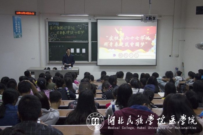 本网讯(记者 张红珠 徐祎 刘心星)10月16日晚,由共青团湖北民族学院医学院委员会主办的喜迎祖国67华诞主题团日活动在我院8204教室顺利举行。本次大会由学生干部姚明泽担任主持,我院15、16级与各二级学院共两百多名学生参加了此次活动。