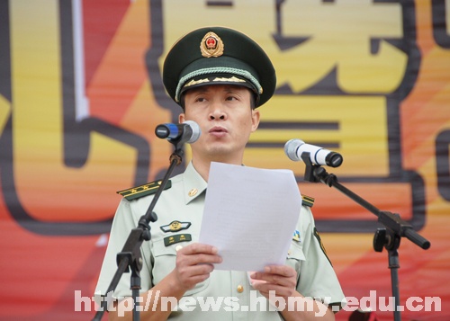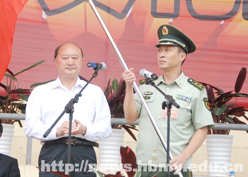 在随后举行的军训动员大会上,副院长汪兴平宣读了《关于成立湖北民族学院2011学生军训团的决定》,学校党委书记胡茂成为军训团授旗。武警恩施支队副支队长姜东中校发表讲话,他要求全体教官要以身作则,希望全体新同学们珍惜参加军事锻炼的机会,锻造体格,磨练意志,为接下来的大学生活打下坚实的基础。教官代表陈飞宣读《决心书》后,军训团团长姜东正式发布军训命令,由各二级学院组成的12个连队开赴各自场地,开始了为期两周的军事训练。