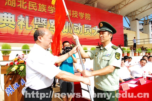 军训动员大会上,副院长汪兴平宣读了《关于成立湖北民族学院2012学生军训团的决定》,学校党委书记胡茂成为军训团授旗。武警恩施支队副支队长姜东中校发表动员讲话,他希望全体军训学员端正思想,提高认识,服从命令,听从指挥,不畏艰难,敢于吃苦,为接下来的大学生活打下坚实的基础,再创辉煌。军训团团长姜东正式发布军训命令,由各二级学院组成的12个连队开赴各自场地,开始了为期两周的军事训练和国防教育。