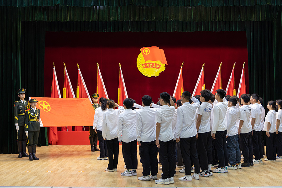 “我志愿加入中国共产主义青年团,坚决拥护中国共产党的领导……”5月4日下午,铿锵有力的入团誓词在行政楼一号会议室里久久回响,来自各学院(部)的46名新团员高举右手,面向鲜红的团旗庄严宣誓。