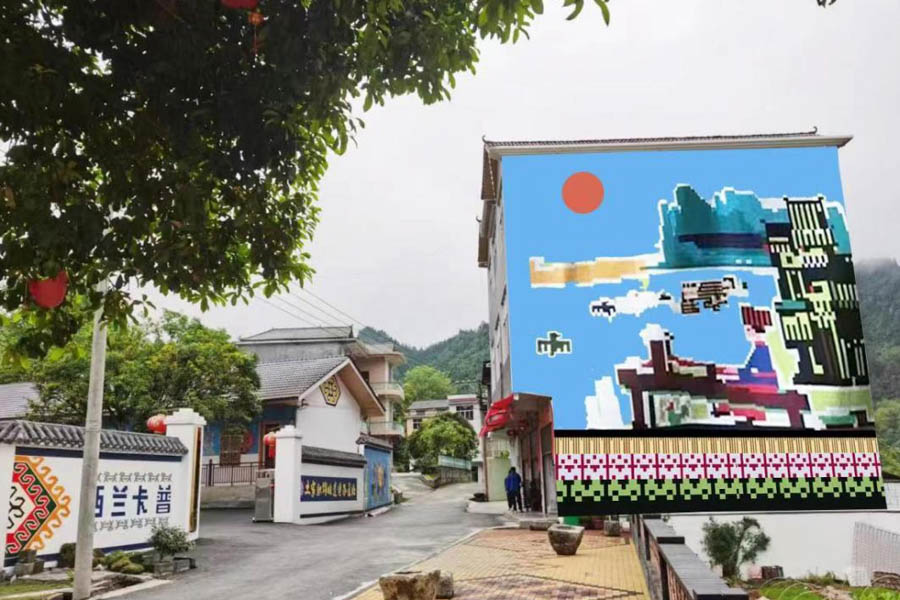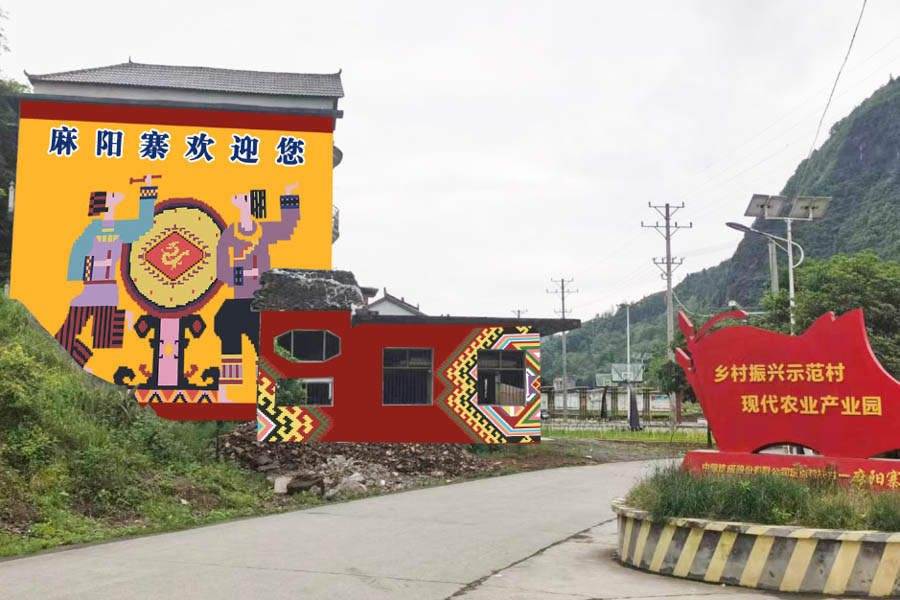 此前,教工第二党支部组织党员积极参与了当地乡村振兴的实践工作,他们与村民们一起探讨乡村发展的问题和挑战,共同寻找解决方案。党员教师向思全组建团队在对麻阳寨村进行深入调研考察的基础上,对“西兰卡普”纹样进行大量的研究分析,最终形成了“研学基地+村庄建筑”的整体墙绘美化方案,并以“高罗镇麻阳寨村共同缔造墙绘项目”立项为横向课题。项目分研学基地内外两期实施,研学基地内部以西兰卡普的历史文化、工艺流程为基础,选取经典传统纹样和现代纹样共计30余幅,系统而直观地展示西兰卡普基地的文化特点。研学基地外部则以临近建筑为画面进行大画幅视觉化展示,绘制了迎宾大鼓、阳雀报喜、西兰姑娘三个篇章十余栋墙绘画面,共计1000余方,用强烈的视觉冲击再现了西兰卡普的经典画面。丰富多彩的墙绘纹样,不仅展现了西兰卡普研学基地的文化魅力,还为美丽的麻阳寨村增添了一道靓丽的人文风景。通过艺术赋能乡村振兴的方式,他们希望能够激发村民们的创造力和活力,推动乡村经济的发展,共同缔造美好家园。