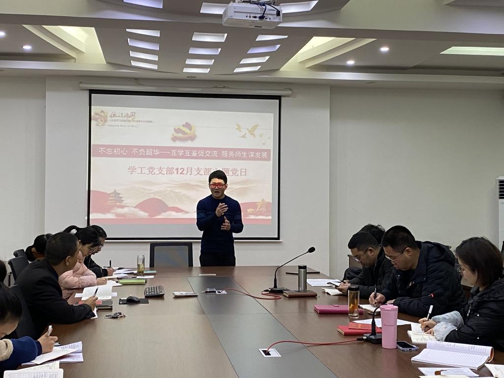 (通讯员 彭弥)2020年12月17日,学工党支部在学工会议室召开12月支部主题党日。本次主题党日实践环节特别邀请优秀学生代表易鑫域、沈浩作理论宣讲,师生交流热烈,互动教育成效突出。
