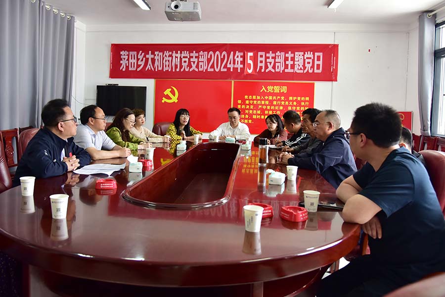 全体党员在太和街村委会二楼会议室开展理论研学及交流。由5月份入党的同志领誓,全体党员重温入党誓词;听取了宣传部党支部书记罗翔宇讲授的《廉洁教育:从纪律自觉到文化自觉》的专题党课。太和街村支部书记刘德胜同志从“一万两千三百”即一万亩烟叶,两千亩蔬菜,一百家民宿、一百棚菌菇、一百名网络红人等内容,详细介绍了“文化兴村、农旅活村、康养强村”的情况。驻村第一书记胡启发介绍了以“善”文化为内涵的四大支柱产业,回顾了该村作为“中国少数民族特色村寨”和“全国美丽休闲乡村”的发展脉络。